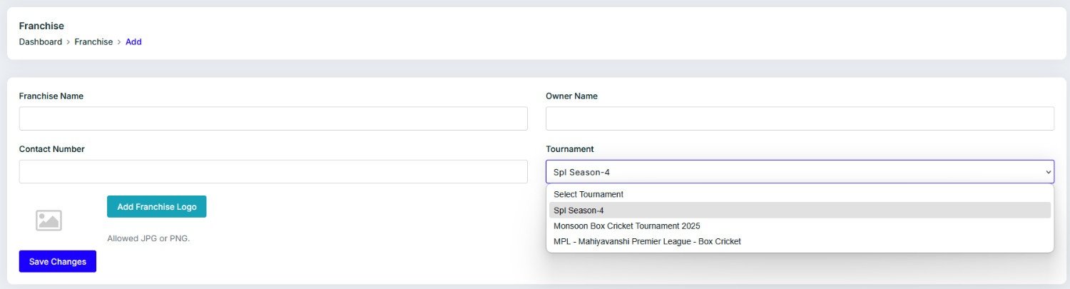 To add a new team, click the 'Add New' button. This action takes you to a new screen. Fill in all the necessary data, select the tournament in which you want to add this team, and click 'Save Changes' to complete the process.