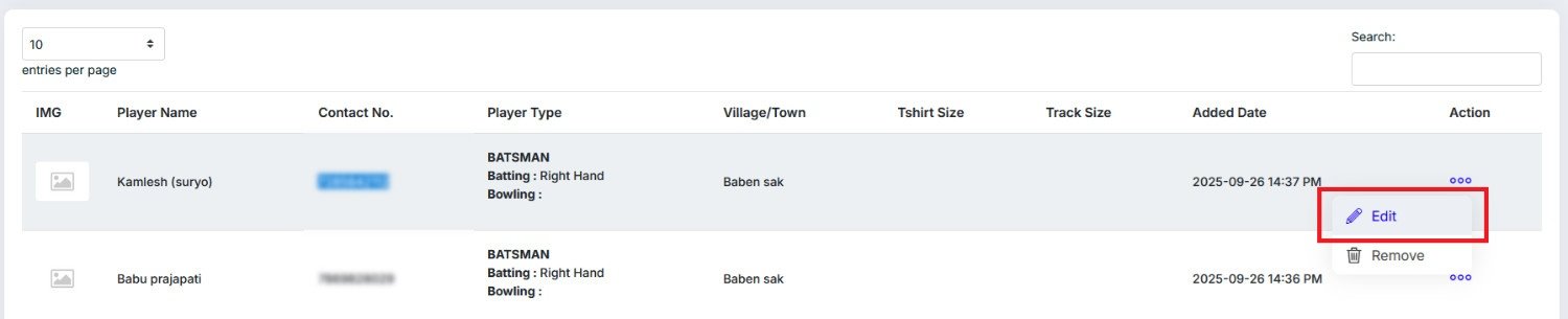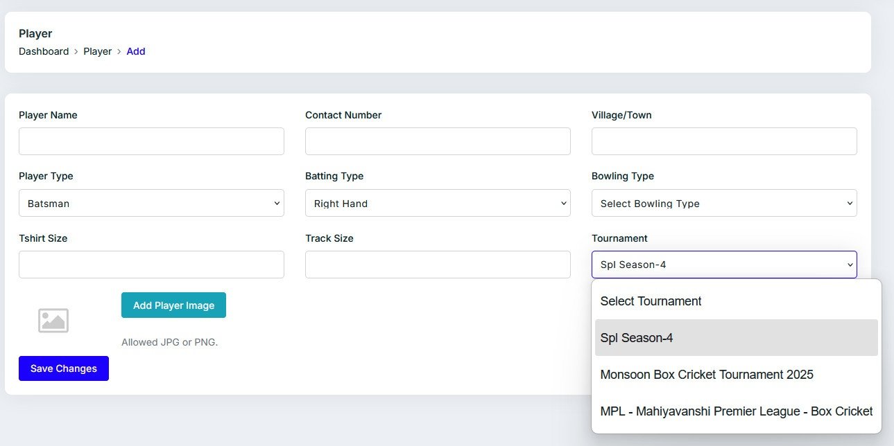 To add a new player, click the 'Add New' button. This action takes you to a new screen. Fill in all the necessary data, select the tournament in which you want to add this player, and click 'Save Changes' to complete the process.
