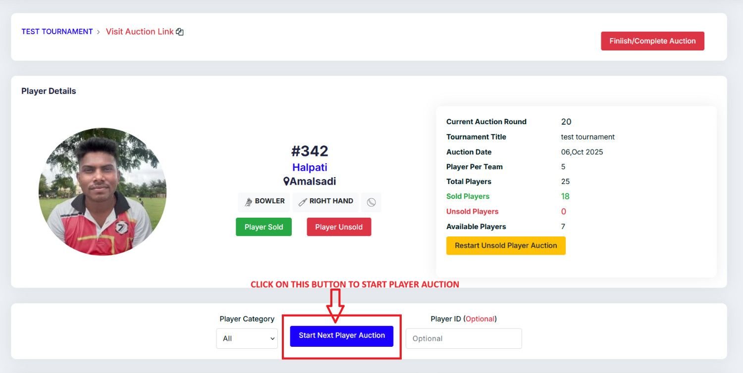 To start the player auction, just click on the 'Start Next Player Auction' button. You can also filter players by category. If you want to run an auction for a specific player, just insert the Player ID in the 'Player ID' box and click the button.