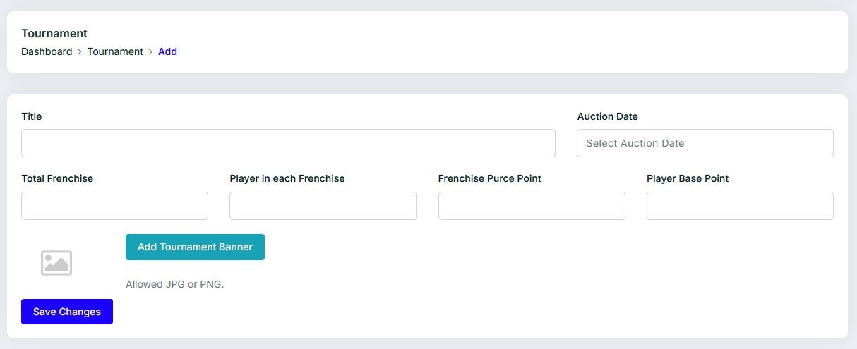For adding a new tournament, click the 'Add New' button. This will take you to a new screen. Fill in all the necessary data and click 'Save Changes' to complete the process.