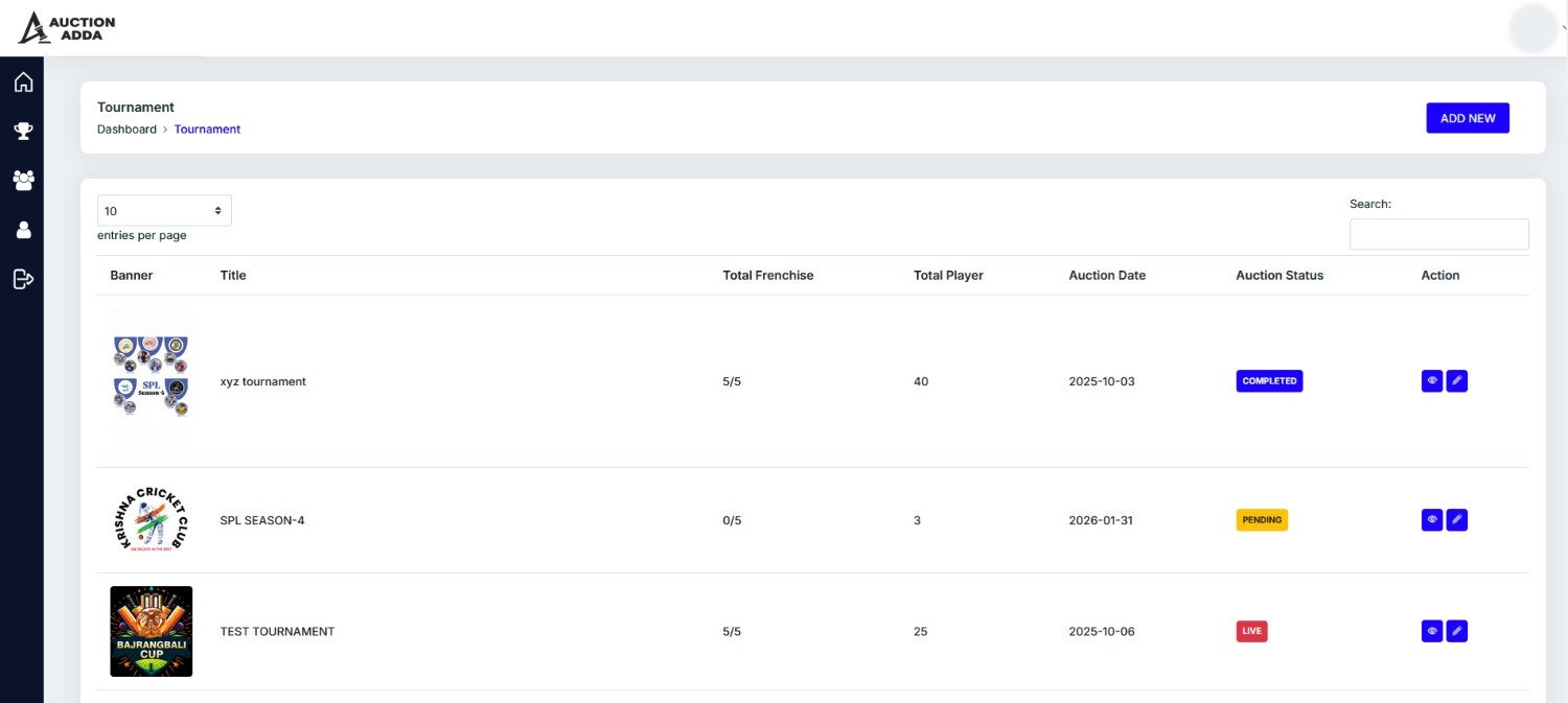 From the left-side menu, click on the 'Tournaments' tab, and you will see the Tournament page, which lists all the tournaments you have added.